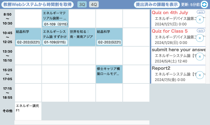一度、教務webシステムを開いてから、画面左上のボタンをクリックすると、教務webシステムから時間割情報を取得できます。